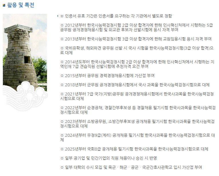 한국사능력검정시험 활용 분야 및 유효기간