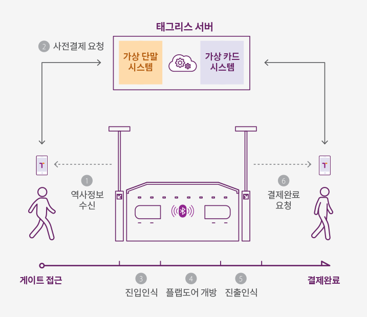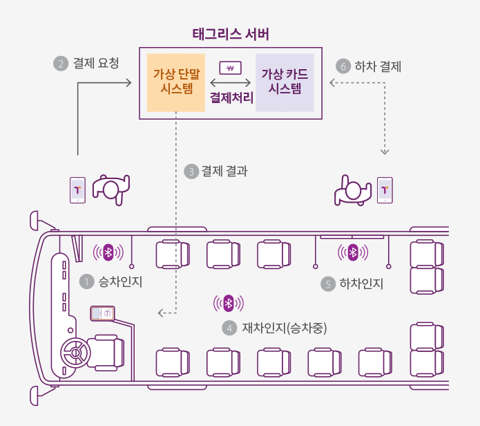 - 단말 시스템의 백엔드 서버가 탑승·하차 데이터를 분석해 자동으로 요금을 계산한 후, 티머니 가상 계정에서 결제합니다.