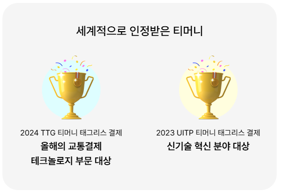 티머니 태그리스 시스템은 2023년 세계대중교통협회(UITP) 혁신상, 2024년 교통결제 기술대상 등 국제적으로 기술력을 인정받았습니다.